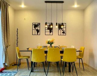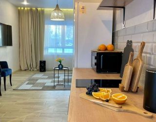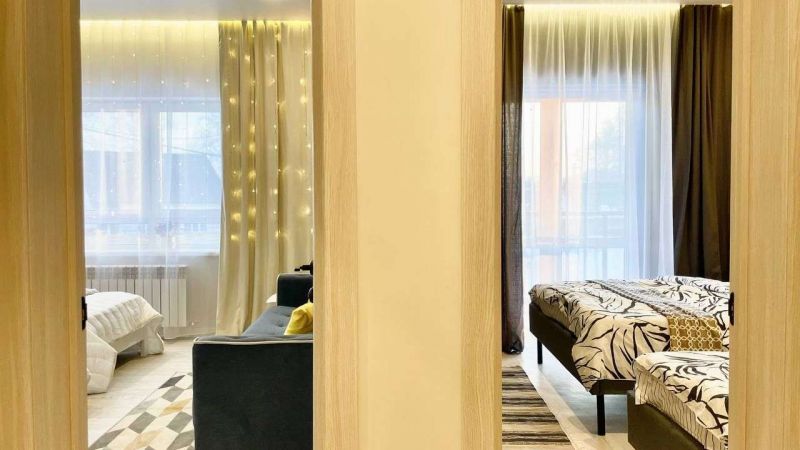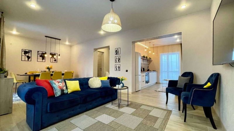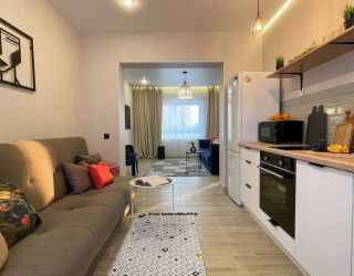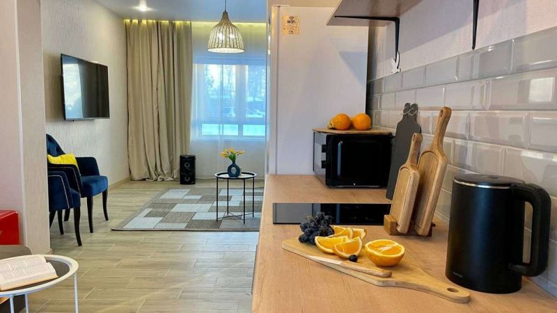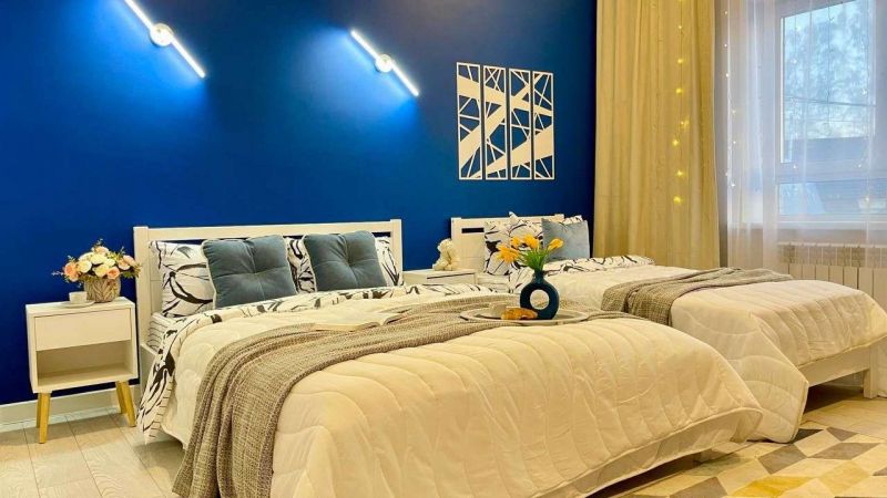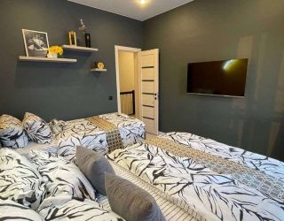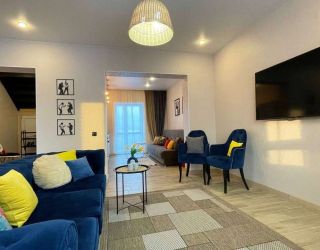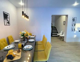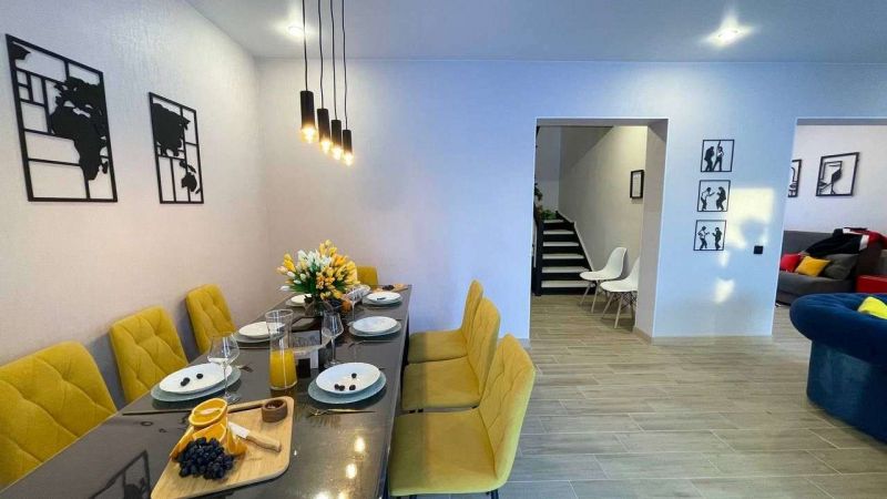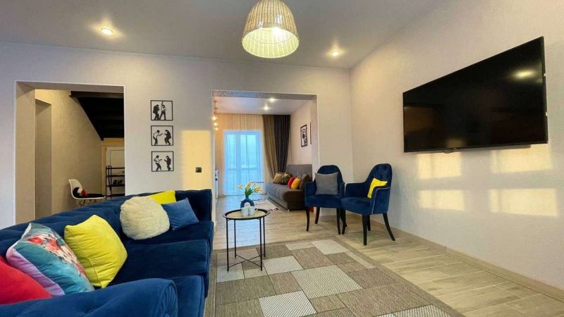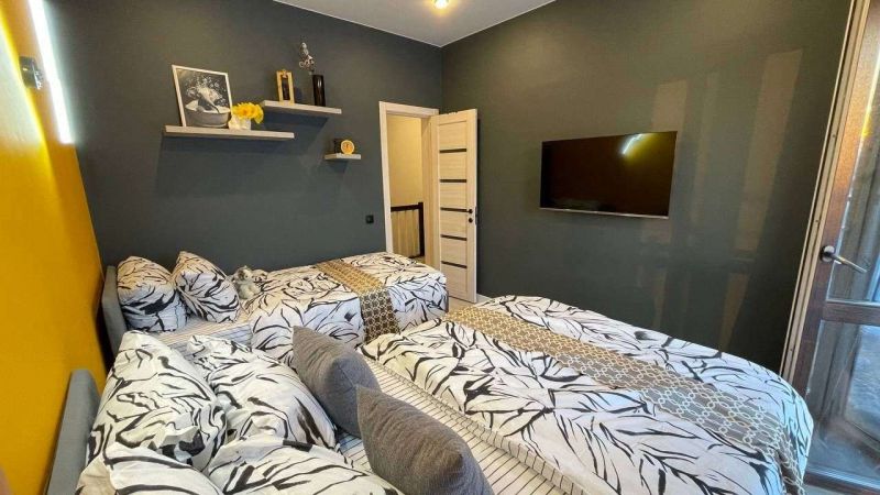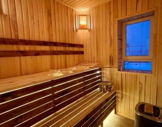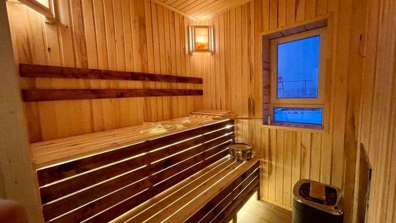 Двухэтажный кирпичный коттедж с террасой, рассчитанный на 6 человек, занимает небольшую закрытую территорию. Внутри – 3 комнаты, гостиная и кухонная зона с электроплитой, духовым шкафом, набором посуды, есть 2 санузла с душем и собственная сауна. Среди прочих удобств – стиральная и посудомоечная машина, игровая приставка и безлимитный интернет.