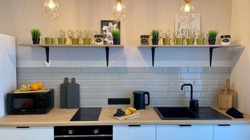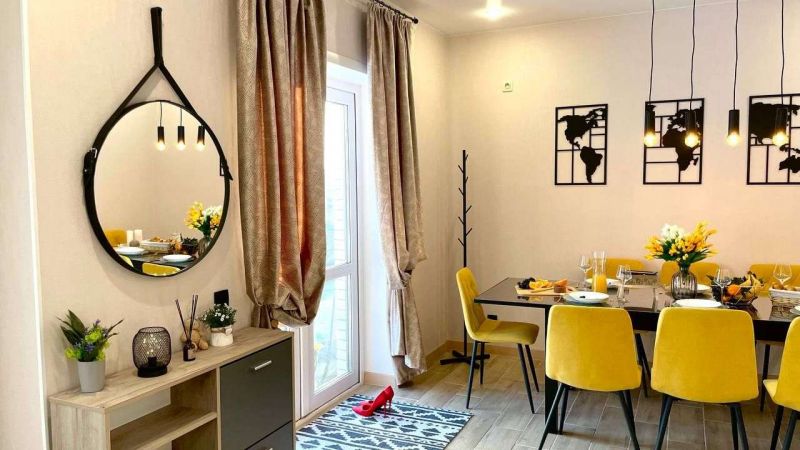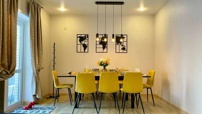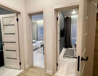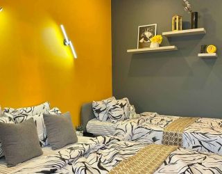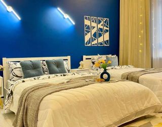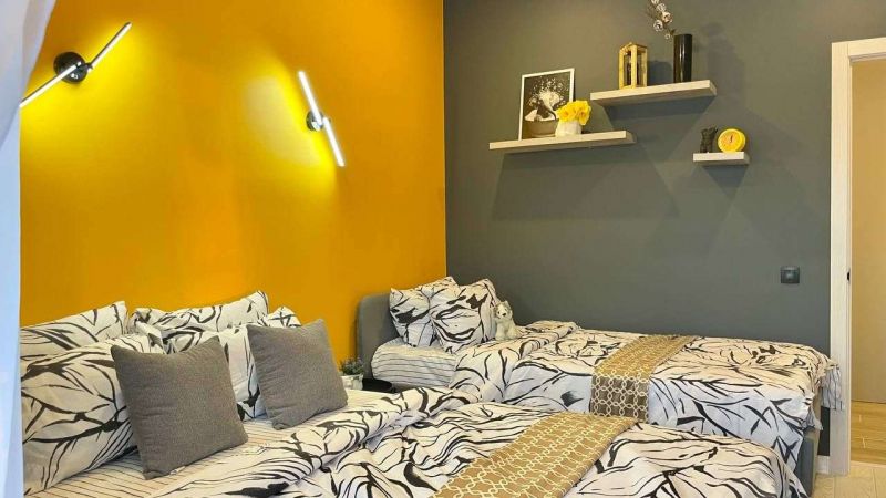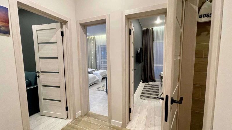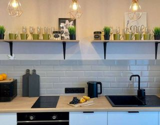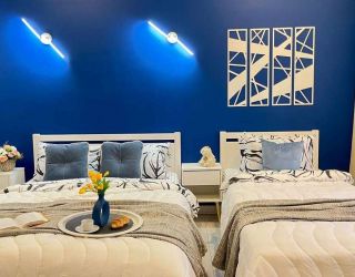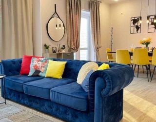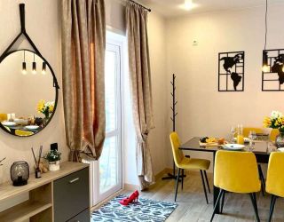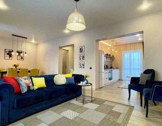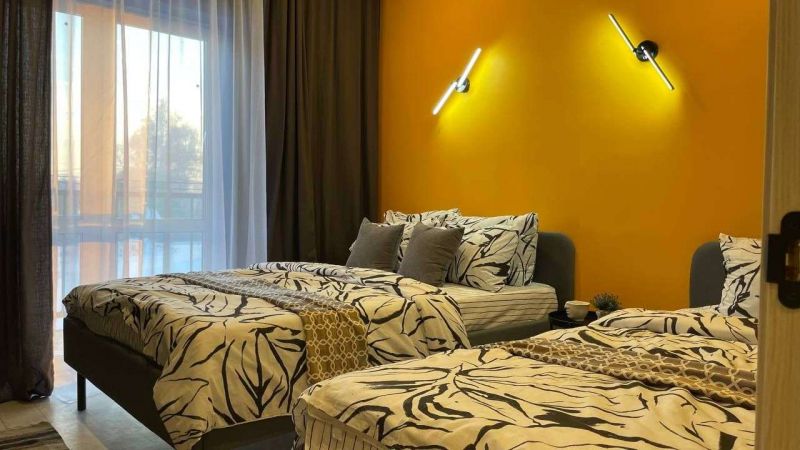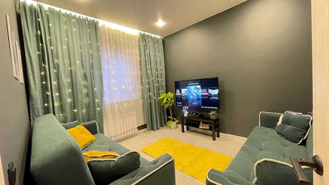 Двухэтажный кирпичный коттедж с террасой, рассчитанный на 6 человек, занимает небольшую закрытую территорию. Внутри – 3 комнаты, гостиная и кухонная зона с электроплитой, духовым шкафом, набором посуды, есть 2 санузла с душем и собственная сауна. Среди прочих удобств – стиральная и посудомоечная машина, игровая приставка и безлимитный интернет.
